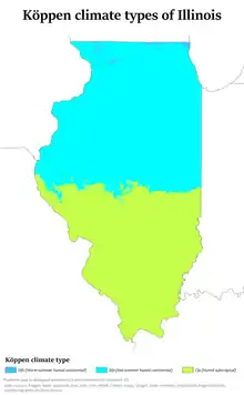 "Illinois's climate is changing. Most of the state has warmed by about one degree (F) in the last century. Floods are becoming more frequent, and ice cover on the Great Lakes is forming later or melting sooner. In the coming decades, the state will have more extremely hot days, which may harm public health in urban areas and corn harvests in rural areas".[1] In May 2019, The Kansas City Star noted that although it was not yet possible to say whether climate change was contributing to the increasing number of tornadoes in the region, "the band of states in the central United States ... that each spring are ravaged by hundreds of tornadoes — is not disappearing. But it seems to be expanding", resulting in a higher frequency of tornadoes in states including Illinois.[2] In 2015, The Washington Post reported that "by the end of the century... Chicago could become a lot like today’s Texas, having even more days per year above 95 degrees than the Lone Star State currently does".[3]