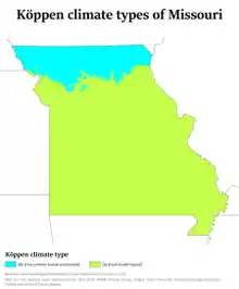 The United States Environmental Protection Agency reports that "Missouri's climate is changing. Most of the state has warmed one-half to one degree (F) in the last century, Severe weather and floods are becoming more frequent. In the coming decades, the state will have more extremely hot days, which may harm public health in urban areas and corn harvests in rural areas".[1] In 2015, The Washington Post reported that "by the end of the century, temperatures in Missouri could be a lot like they are in Arizona right now — with between 46 and 115 days above 95 degrees per year".[2]