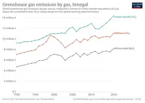 Senegal is currently not a major contributor to global greenhouse gas emissions, contributing less than a ton of CO2 per person per year (compared to the global average of over 6 tons per person per year[11]) and placing 150th in the list of countries by CO2 emissions.[6] However, it is one of the most vulnerable countries to climate change.[6][7]