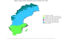 By the 2080s average temperatures are set to rise by 3–5 °C. The climate in the Mälardalen region will be similar to that of northern France. Winter temperatures are likely to see a greater increase than spring, summer and autumn temperatures. By the end of the century winters could be up to 7 °C warmer than today on average. The Norrland coast will probably be the region that sees the highest increases in temperature.[40] In May 2018 mean temperature was more than in average +5 °C in most Sweden and +2.5 °C in most Europe. In July 2018 mean temperature was more than in average +3-4 °C in most Sweden.[41] In July 2018 Italy, Norway, Poland and France sent help to fight the dozens of forest fires in Sweden.[42]