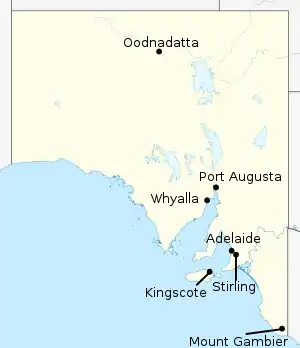 | Port Augusta[44] | BWh | 34 °C (93 °F) | 19 °C (66 °F) | 18 °C (64 °F) | 5 °C (41 °F) | 142 | 218 mm (9 in) |