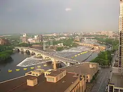 Because of its location in the center of North America, the Twin Cities region is subjected to some of the widest temperature ranges in the United States. Temperatures in the Twin Cities region range from an average of 15.6 °F (−9.1 °C) in January to 73.8 °F (23.2 °C) in July.[4] With no natural barriers to block cold air from pouring south from Canada, the Twin Cities are subjected to many arctic air masses throughout the winter months. These arctic air masses bring with them cold temperatures and sometimes strong winds. The Twin Cities has a comparable average summer temperatures to other nearby metropolitan areas such as Chicago, but the arctic outbreaks during the winter push the average winter temperature of the Twin Cities below that of Chicago's. Despite being located just 350 miles (563 km) from Chicago, the Twin Cities' average January temperature of 15.6 °F (−9.1 °C) is below Chicago's 23.8 °F (−4.6 °C).[7][lower-alpha 3] During summer months, Minneapolis can be subject to hot temperatures from May to September, and high humidity.