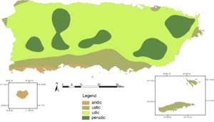 The climate of Puerto Rico in the Köppen climate classification is predominately tropical rainforest. Temperatures throughout the year are warm to hot, averaging near 85 °F (29 °C) in lower elevations and 70 °F (21 °C) in the mountains. Easterly trade winds pass across the island year round while the rainy season stretches from April into November.[1] The relatively cool trade winds are blocked by the mountains of the Cordillera Central which causes rain shadows and sharp variations in the temperature and wind speed over short distances. About a quarter of the average annual rainfall for Puerto Rico occurs during tropical cyclones, which are more frequent during La Niña years.