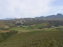 Cloete's Pass is situated in the Western Cape province of South Africa, on the Regional road R327 between Van Wyksdorp and Herbertsdale. The Langeberg mountain range separates the southern Cape coast from the Little Karoo. One of the little-known passes is the Cloete's pass, named after the Cloete family who owned the farm there. It is a gravel pass that features many flowering plants and ruins of old toll houses and blockhouses built by the British during the Anglo-Boer war.