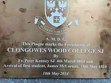 Clongowes Wood College is a voluntary boarding school for boys, located near Clane in County Kildare, Ireland. The school was founded by the Society of Jesus (Jesuits) in 1814,[2] and featured prominently in James Joyce's semi-autobiographical novel A Portrait of the Artist as a Young Man. One of five Jesuit schools in Ireland, it had 450 students in 2019.[3]