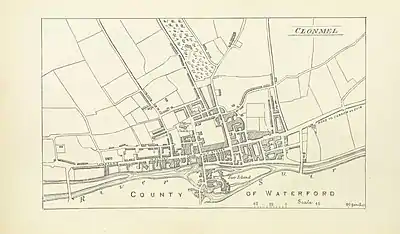 Clonmel (Irish: Cluain Meala, meaning "honey meadow") is the county town and largest settlement of County Tipperary, Ireland. The town is noted in Irish history for its resistance to the Cromwellian army which sacked the towns of Drogheda and Wexford. With the exception of the townland of Suir Island, most of the borough is situated in the civil parish of "St Mary's"[2] which is part of the ancient barony of Iffa and Offa East.