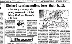 Within three months of formation, the Friends of the Railway had 400 members.[11] By May, Friends of the Railway had gathered 100,000 signatures on a petition against the closure and prepared a detailed report rebutting arguments in favour of the railway closure and laying out an alternative proposal for the electrification of the system. This garnered widespread media coverage and as protests grew, comparisons were made to the community opposition around the demolition of the Pensioners Barracks.[12] Under pressure from the community and local governments including Fremantle and Subiaco the Minister for Transport announced he would review the submission and present it before cabinet. The Minister requested additional information from Friends of the Railway, which they provide by June.