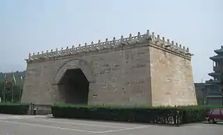 By the early Ming Dynasty (1368–1644) two of the three dagobas on the platform had collapsed or had been dismantled.[7] By the reign of the Zhengtong Emperor (1427–1464) no dagobas remained, and the structure was given the name "Cloud Platform", because from a distance it seemed to rise out of the clouds.[4] A project to restore the platform was carried out between 1443 and 1450. When the platform was surveyed by a Japanese expedition in 1943 a stele commemorating the restoration, dated 1448, was found on top of the platform.[8] However, the restoration was not completed until 1450, as evidenced by an inscription on the far right-hand side of the inner west wall of the platform, dated the 15th day of the 5th month of the 15th year of the Zhengtong era (1450), that records that the restoration was carried out by a benefactor named as Lin Puxian (林普賢).[9] The restoration involved building a five-roomed wooden Buddhist hall, called the Tai'an Temple (泰安寺), on top of the platform, in place of the original dagobas.[2][10]
