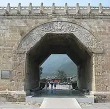 The Cloud Platform at Juyongguan (simplified Chinese: 居庸关云台; traditional Chinese: 居庸關雲臺; pinyin: Jūyōngguān Yúntái) is a mid-14th-century architectural feature situated in the Guangou Valley at the Juyongguan Pass of the Great Wall of China, in the Changping District of Beijing Municipality, about 60 kilometres (37 mi) northwest of central Beijing. Although the structure looks like a gateway, it was originally the base for three white dagobas or stupas, with a passage through it, a type of structure known as a "crossing street tower" (simplified Chinese: 过街塔; traditional Chinese: 過街塔; pinyin: Guòjiētǎ). The platform is renowned for its Buddhist carvings and for its Buddhist inscriptions in six languages. The Cloud Platform was the 98th site included in the first batch of 180 Major Historical and Cultural Sites Protected at the National Level as designated by the State Council of China in April 1961.[1]