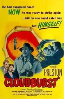 Cloudburst is a 1951 British crime drama film, directed by Francis Searle, starring Robert Preston and featuring Elizabeth Sellars, Harold Lang, Colin Tapley and Sheila Burrell. The script is based on a play written by Leo Marks,[1] a wartime cryptographer for the Special Operations Executive, and later the author of a memoir about his wartime work, Between Silk and Cyanide (1998). The film is about a World War II veteran, a former operative for the SOE, who seeks revenge on the driver and passenger of a hit-and-run automobile that struck and killed his wife.[2]