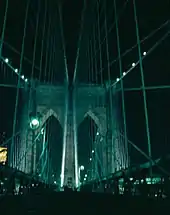 When the party-goers leave the building, the severed head of the Statue of Liberty is hurled into the street in front of them. Hud records an enormous creature several blocks away collapsing the Woolworth Building. Later, during the city's evacuation, the creature's tail destroys the Brooklyn Bridge, killing Jason and several other people. News reports show the Army National Guard's 42nd Infantry Division attacking the monster. Smaller parasite creatures fall off its body and attack nearby pedestrians and soldiers.[lower-alpha 1]