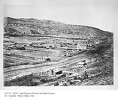 Coalville originally began as a settlement known as Chalk Creek. In 1854, the territorial government in Utah offered a $1000 reward to anyone who could find coal within 40 miles of Salt Lake City. Four years later, Thomas Rhodes found a coal vein in the Chalk Creek area, and coal mining began in earnest.[6] Hundreds of tons of coal were shipped to Salt Lake City, and soon a narrow gauge railroad was built.[7] The settlement was then renamed Coalville, as a result of this early success.
