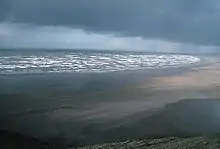 If the coast suddenly changes direction, especially around an estuary, spits are likely to form. Long shore drift pushes the sediment along the beach but when it reaches a turn as in the diagram, the long shore drift does not always easily turn with it, especially near an estuary where the outward flow from a river may push sediment away from the coast. The area may also be shielded from wave action, preventing much long shore drift. On the side of the headland receiving weaker waves, shingle and other large sediments will build up under the water where waves are not strong enough to move them along. This provides a good place for smaller sediments to build up to sea level. The sediment, after passing the headland will accumulate on the other side and not continue down the beach, sheltered both by the headland and the shingle.