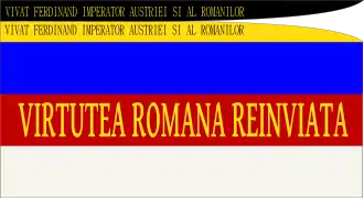 This "flag of the Transylvanian Romanians" was transformed into a red-blue-white, blue-red-white or white-blue-red tricolor, bearing the inscription VIRTUS ROMANA REDIVIVA ("Roman virtue revived").[131] The slogan's origin can be traced back to Romanian Grenz infantry regiments serving on the Transylvanian Military Frontier.[132] A blue-red-white variant was inscribed with VIRTUTEA ROMÂNĂ REÎNVIATĂ ("Romanian virtue revived"), and carried ribbons in the Habsburg colors, with a slogan honoring Ferdinand I.[133] Several authors note that such a color scheme merely reflected confusion among the Romanians, allowing Hungarians in the Diet to report that it was a pan-Slavic symbol.[45][127][134] In Fogaras (Făgăraș) and Fellak (Feleac), Romanians, specifically Eastern Catholics, opted for alternative flags of blue and yellow.[135]