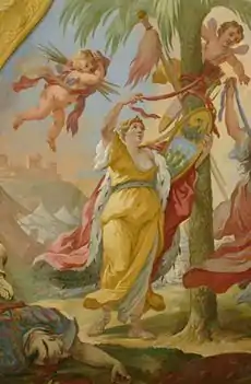 Flags captured by Michael and his Habsburg ally Giorgio Basta during the Battle of Guruslău, some of which are also depicted in paintings by Hans von Aachen, give additional insight into the Principality's heraldic symbolism. Samples include blue and white Székely flags displaying the old and new symbols together.[43] A variety of Báthory flags were captured on the field of battle, prominently displaying the "wolf's teeth", but with no element from the coat of arms.[44] As noted in 1910 by historian Iosif Sterca-Șuluțiu, "they are of all sort of colors and shapes, none of which have any significance."[45] According to researcher Constantin Rezachevici, the white variant in Aachen's painting (displaying what Rezachevici identifies as "elephant tusks") was the inspiration for Michael the Brave's own flag of Wallachia.[46]
