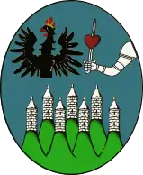 | Blazon | Per fess Azure and Or, a fess Gules between in chief an eagle issuant from the division Sable flanked by a sun-in-splendour Or and an increscent Argent, and in base seven towers Gules. |