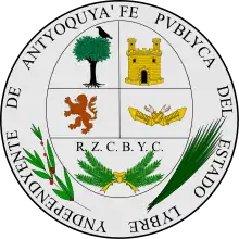 Oval argent, marshalled quarterly: I an oak eradicated trunked sable, a crow proper trussed atop the oak, II a tower Or, masoned sable and ajouré azure, III two arms armoured Or their forearms pilewise, hands naked, IV a lion rampant tenné. On base argent, a garland of six fern branches gathered at the middle by a ribbon in bow Or, atop inscribed are the initials R.Z.C.B.Y.C. The whole flanked by a branch of coffee fructed and a branch palm both proper, in a circle void inscribed with Fe Pvblica Del Estado Lybre E Yndependyente De Antioquya (Castilian: Public Faith of the Free And Independent State of Antioquia).
