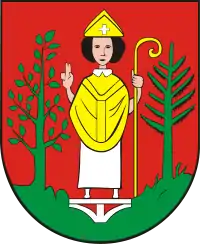 The coat of arms of Lubawa (German: Löbau in Westpreußen) in the Warmian-Masurian Voivodeship, Poland, depicts a bishop of Chełmno or Culm, generally identified as the first bishop, Christian of Oliva (who according to the 1216 bull by Pope Innocent III baptised the local duke of the Prussians, Surwabuno), with his right hand raised in benediction. He stands between a lime tree and a fir tree.