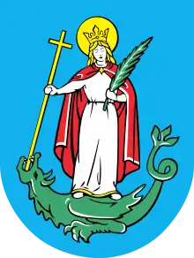 The coat of arms of Nowy Sącz in Poland shows Saint Margaret the Virgin, depicting the legend that she was swallowed by Satan, in the form of a dragon, who was however forced to spit her out again because the cross she was carrying irritated the dragon's innards. In Margaret's other hand is an olive branch, a symbol of peace.[1]