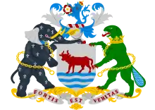 Arms: Argent an Ox Gules armed and unguled Or passing over a Ford of Water in base barry wavy Azure and Argent. Crest: On a Wreath of the Colours a demi Lion rampant guardant Azure crowned with an Imperial Crown proper holding between the paws a Rose Gules charged with another Argent. Supporters: On the dexter side an Elephant Ermines eared Argent tusked Or collared and lined Or and on the sinister side a Beaver Vert its tail barry wavy [= scaly] Azure and Argent ducally gorged and lined Or. Motto: FORTIS EST VERITAS - Strong is truth