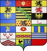 The coat of arms of the present-day German free state of Saxony shows a tenfold horizontally-partitioned (Barry of ten) field of black (sable) and gold/yellow (or) stripes,[1] charged with a green (vert) crancelin (a stylized common rue) running from the viewer's top-left to bottom-right (in bend). Although the crancelin is sometimes shown bent (embowed) like a crown, this is due to artistic license.[2] The coat of arms is also displayed on the state flag of Saxony.[2]