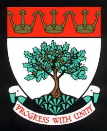 Arms: Argent issuant from a Grassy Mount in base an Oak Tree proper fructed Or on a Chief Gules three Saxon Crowns Or. Motto: 'PROGRESS WITH UNITY'.
