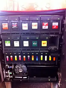 The cabinetry was designed by the Italian automotive design firm Pininfarina, via their Pininfarina Extra industrial and product design subsidiary.[6] Technologies involved include microdispensing technology and proprietary PurePour technology. Both technologies were originally developed to deliver precise doses of drugs.[1] One Freestyle unit with a similar footprint to a current vending machine can dispense 126 kinds of carbonated and non-carbonated beverages. Microdosing blends one or more concentrated ingredients in 46 US fl oz (1.36 L) packets with water and sweetener at the point where the beverage is dispensed,[4] thus avoiding the use of traditional 5 US gal (18.9 L) boxes of syrup (also known as a bag-in-a-box).[7] Cartridges store concentrated ingredients in the dispenser cabinet and are RFID enabled. The machine uses RFID chips to detect its supplies and to radio resupplying needs to other units. The machines transmit supply and demand data to both Coca-Cola and the owner including brands sold, times of the day of sales, troubleshooting information, and service data.[8] The traditional ice cube dispenser remains.[9]