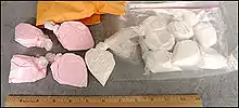 Cocaine is a powerful nervous system stimulant.[26] Its effects can last from 15 minutes to an hour. The duration of cocaine's effects depends on the amount taken and the route of administration.[27] Cocaine can be in the form of fine white powder, bitter to the taste. When inhaled or injected, it causes a numbing effect. Crack cocaine is a smokeable form of cocaine made into small "rocks" by processing cocaine with sodium bicarbonate (baking soda) and water.[11][28] Crack cocaine is referred to as "crack" because of the crackling sounds it makes when heated.[11]