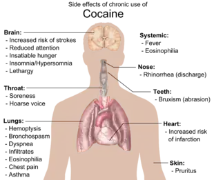 Cocaine is addictive due to its effect on the reward pathway in the brain.[12] After a short period of use, there is a high risk that dependence will occur.[12] Its use also increases the risk of stroke, myocardial infarction, lung problems in those who smoke it, blood infections, and sudden cardiac death.[12][15] Cocaine sold on the street is commonly mixed with local anesthetics, cornstarch, quinine, or sugar, which can result in additional toxicity.[16] Following repeated doses a person may have decreased ability to feel pleasure and be very physically tired.[12]