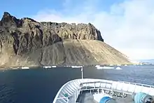 Geologically, the area makes up the Cockburn Island Formation, which was studied extensively in the late 1990s by H. A. Jonkers.[1] Rocks found on the island are volcanic,[2] and the island is characterized by its "precipitous cliffs".[3] A "Pecten conglomerate" from the late Pliocene or early Pleistocene period has been identified on the island, situated on a wave-cut platform at 720–820 ft.[4] The island is a rare volcano type called a tuya, or moberg, which was formed by a three-stage eruption sequence below an ice cap. The first stage was a subglacial hyaloclastic eruption under a thick ice cap, which shattered the lava into glass, ash and sand, which has since weathered to yellow palagonite layers. The second phase was a lava eruption into a meltwater glacial lake contained in the ice cap, which resulted in volcanic breccia and basalt pillow lava (boulders of this can be seen along the shore). The final phase was subaerial basalt lava flows on top of the previous volcanic deposits after the lake drained or boiled away.