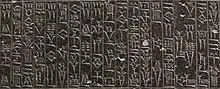 The code was discovered by modern archaeologists in 1901, and its editio princeps translation published in 1902 by Jean-Vincent Scheil. This nearly complete example of the code is carved into a diorite stele[4] in the shape of a huge index finger,[5] 2.25 m (7.4 ft) tall. The code is inscribed in the Akkadian language using cuneiform script. The material was imported into Sumeria from Magan - today the area covered by the United Arab Emirates and Oman.[6]