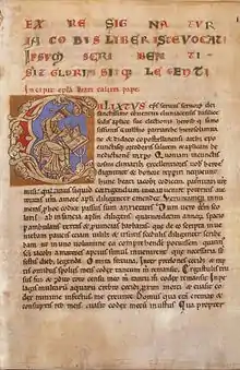 The letter of Pope Callixtus II which opens the book, occupies both recto and verso of the first two folios.[11] The author, who claims to be Callixtus II, tells how he collected many testimonies on the good deeds of Saint James, "traversing the cruel grounds and provinces for fourteen years". He also describes how the manuscript survived many hazards from fire to drowning.[12] The letter is addressed "to the very holy assembly of the basilica of Cluny" and to "Diego, archbishop of Compostela".