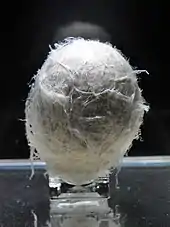 Coelacanth eggs are large with only a thin layer of membrane to protect them. Embryos hatch within the female and eventually are given live birth, which is a rarity in fish. This was only discovered when the American Museum of Natural History dissected its first coelacanth specimen in 1975 and found it pregnant with five embryos.[61] Young coelacanths resemble the adult, the main differences being an external yolk sac, larger eyes relative to body size and a more pronounced downward slope of the body. The juvenile coelacanth's broad yolk sac hangs below the pelvic fins. The scales and fins of the juvenile are completely matured; however, it does lack odontodes, which it gains during maturation.[7]