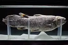 | Preserved specimen of West Indian Ocean coelacanth caught in 1974 off Salimani, Grand Comoro, Comoro Islands | |