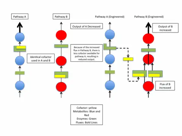 In cofactor engineering, a metabolic pathway is altered by changing the concentrations of specific cofactors that are produced either in that particular pathway or in a separate pathway. For example, an hypothetical organism could have two arbitrary pathways called A and B where some enzymes in both A and B utilize the same cofactors. If scientists wanted to decrease the output of pathway A, they may first consider directly engineering the enzymes involved in A, perhaps to decrease a particular active site's affinity for its substrate. In some cases however, the enzymes in A may be difficult to engineer for various reasons, or it may be impossible to engineer them without dangerously affecting some third metabolic pathway C, which utilizes the same enzymes. As a separate option, scientists could increase the flux of B, which may be easier to engineer. This in turn could "tie up" the cofactors needed by A, which would slow enzymatic activity, decreasing output in A. This is one hypothetical example of how cofactor engineering can be used, but there are many other unique cases where scientists use cofactors as a way of altering metabolic pathways. A major advantage to cofactor engineering is that scientists can use it to successfully alter metabolic pathways that are difficult to engineer by means of ordinary metabolic engineering. This is achieved by targeting more easily engineered enzymes in separate pathways, which use the same cofactors. Since many cofactors are used by different enzymes in multiple pathways, cofactor engineering may be an efficient, cost effective alternative to current methods of metabolic engineering.[8]