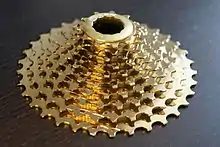 On a bicycle, the cogset or cluster[1] is the set of multiple sprockets that attaches to the hub on the rear wheel. A cogset works with a rear derailleur to provide multiple gear ratios to the rider. Cogsets come in two varieties, freewheels or cassettes, of which cassettes are a newer development. Although cassettes and freewheels perform the same function and look almost the same when installed, they have important mechanical differences and are not interchangeable.