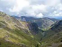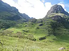 Coire Gabhail (Corrie of the Bounty,[1] or The Hollow of Capture[2]) is a high level glen in the Bidean nam Bian mountain massif to the south of Glen Coe, Highland, Scotland. Its narrow entrance 230 metres (750 ft) up the hillside conceals the width of the glen beyond, and it is commonly known as the Hidden Valley or Lost Valley of Glencoe. Access from a bridge crossing the River Coe is by a steep path up beside a narrow wooded ravine.[3][4]