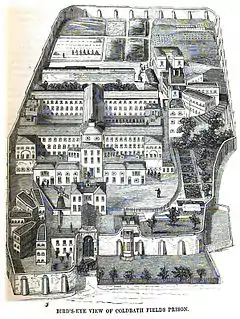 Coldbath Fields Prison, also formerly known as the Middlesex House of Correction and Clerkenwell Gaol and informally known as the Steel,[1] was a prison in the Mount Pleasant area of Clerkenwell, London. Founded in the reign of James I (1603–1625) it was completely rebuilt in 1794 and extended in 1850.[2] It housed prisoners on short sentences of up to two years. Blocks emerged to segregate felons, misdemeanants and vagrants.