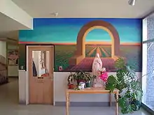 After the closure of Colegio Cesar Chavez, the facilities and grounds were left unused and abandoned for several years. Eventually, a private benefactor purchased the former Colegio grounds and facilities and donated it back to its pre-Colegio owners, the Benedictine Sisters of Mt. Angel. Today, the former Colegio grounds and facilities are used as St. Joseph Shelter.[11] Shortly after reclaiming ownership of the former Colegio building, the Benedictine Sisters had all but one Colegio-era mural painted over. The one remaining mural is titled "College Without Walls" and was created by Daniel Desiga.[12][13] The mural depicts an arch entry overlooking a vast strawberry field. The arch has been interpreted as representing the college without walls program of Colegio, and the vast strawberry field in the background is likely a reference to the field workers and the fact that many Colegio teachers and students had either worked in the fields or were from families who had survived by means of field work.
