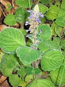 Coleus cremnus, synonym Plectranthus cremnus,[1] is a rare herb only found in a few sites in the north coast of New South Wales. It occurs in shallow sandy soils in rocky coastal headlands such as Evans Head, Lennox Head and Sawtell. The foliage is hairy with a pleasant geranium type scent. Purple tinged blue flowers occur at any time of the year. A few erect flowering branchlets rise from the usual low creeping form.