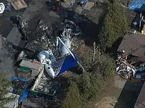 In its final moments, the aircraft pitched up 31 degrees, then pitched down 25 degrees, then rolled left 46 degrees and snapped back to the right at 105 degrees. Occupants aboard experienced g-forces estimated at nearly 2 Gs. The crew made no emergency declaration as they rapidly lost altitude and crashed into a private home at 6038 Long Street,[24] about 5 miles (8.0 km) from the end of the runway, with the nose pointed away from the airport. The aircraft burst into flames as the fuel tanks ruptured on impact, destroying the house of Douglas and Karen Wielinski, and most of the plane. Douglas was killed; his wife Karen and their daughter Jill managed to escape with minor injuries. There was very little damage to surrounding homes, even though the lots in that area are only 60 feet (18.3 meters) wide.[25] The home was close to the Clarence Center Fire Company, so emergency personnel were able to respond quickly. Two of the firefighters were injured. Twelve nearby houses were evacuated.[15][22][26][27][28][29][30]