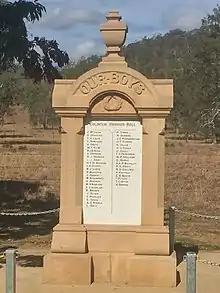 The plan to establish Colinton War Memorial to recognise their war service was initiated in May 1916. "[A] meeting was held to decide in what way to best place on record the excellent response the district has made to the call of the Empire, there having been 46 [sic] good men accepted for service from Colinton and the surrounding district. It has been practically decided to erect a marble slab, bearing the names of those who have volunteered".[28] In August 1916 Joseph H Frisby, secretary of the Colinton Honour Board Committee, was granted permission by the Esk Shire Council to erect an honour board at the Colinton School of Arts, which was the social hub of the town and district, where meetings, dances, balls, and send-offs and memorials for soldiers were held.[29][30][31][1]