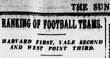 The concept of a national championship in college football dates to the early years of the sport in the late 19th century,[8] and the earliest contemporaneous polls can be traced to Caspar Whitney, Charles Patterson, and The Sun in 1901.[9] Therefore, the concept of polls and national champions predated mathematical ranking systems, but it was Frank Dickinson's math system that was one of the first to be widely popularized. His system named 10–0 Stanford the national champion of 1926, prior to their tie with Alabama in the Rose Bowl. A curious Knute Rockne, then coach of Notre Dame, had Dickinson backdate two seasons, which produced Notre Dame as the 1924 national champion and Dartmouth in 1925.[10]