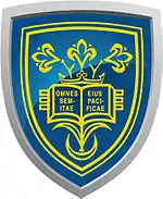 The shield of the college shows a lily, blooming with three flowers symbolizing the three Persons of the Blessed Trinity.[7] The base of the lily is enclosed by a crescent, the heraldic symbol of the Virgin Mary, and the purity of Christian teaching.[8] Symbolizing the college, a book occupies the center of the field, bearing the motto of St. Scholastica. It is adapted from the second part of the Book of Proverbs line "Her ways are ways of beauty, and all her paths are peace," and reads in Latin, "Omnes semitae eius pacificae."[9]