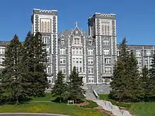 Tower Hall is St. Scholastica's castle-like central building. Its origins date to a picnic in around 1907, when the Diocese of Duluth's Bishop James McGolrick commented that the top of the hill at the College's current site was a perfect location for a building.[11] According to the historic records of Sister Agnes Somers, McGolrick and a group of students and Sisters climbed to the top of the hill and placed a pile of stones, symbolizing the cornerstone of what would eventually become Tower Hall.[12] The following year saw the groundbreaking and start of construction for Tower Hall. Its first unit was completed in 1909. That September, 75 students from the Institute of the Sacred Heart were relocated to what was then called Villa St. Scholastica. Tower Hall was completed in 1928, and had two towers, a north to south axis of 375 feet, turrets at each end, recessed fenestration, and Tudor towers flanking the façade.