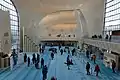 The mosque is in the Ottoman architecture style. It has a concrete and glass dome, and two 55 meter high minarets.[8] The mosque has the bazaar and entrance on the ground floor, lecture halls in the basement, the prayer area on the upper floor and include a Muslim library.[6] A well is placed in the centre to connect the two levels and create a pleasant atmosphere. The mosque consists of flat-like wall screens which form a dome in the centre.[1]