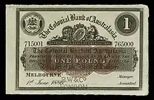 The Colonial Bank of Australasia was incorporated in Melbourne, Victoria, in 1856 by act of council. Branches were established throughout Greater Melbourne and Victoria.[1]