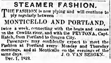 Columbia began its first trip up the Columbia on the morning of July 3, 1850, with James Frost acting as captain.[3] No one on board knew where the channel was, and the steamer's progress was slow. To act as pilots, Frost hired two young people of the Coast Salish who had been fishing on the river. By the end of the first day, they had travelled fifty miles, and Frost, not wanting to risk the vessel in the dark, tied up to the riverbank.[3] The next morning, July 4, 1850, the steamer cast off again and proceeded upstream, arriving at Portland, Oregon (then only a small settlement) at 3:00 p.m.[4] After staying at Portland for abouttwo hours, Columbia then proceeded on to Oregon City, arriving there at 8:00 p.m., where there was a celebration of the vessel's arrival.[2][4] It had taken 26 hours to make the trip.[7]