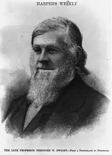 At its founding, four distinct courses of lectures of this class were then established: one on Philology, offered by distinguished scholar and statesman, George P. Marsh; a second by Dr. Francis Lieber, a standard writer upon topics of political science and of international law, then a professor at Columbia College; a third course on Ethics, by Professor Nairne, also of the College; and a fourth on Municipal Law, by Theodore W. Dwight, then Professor of Law in Hamilton College, New York, which at the time already had a flourishing law school.[17] The original course of study to obtain a degree consisted of just two years, rather than the modern standard of three.[17] The first lecture in the law school was delivered on Monday, November 1, 1858, by Mr. Dwight, at the rooms of the Historical Society. It was an introductory lecture, afterwards printed. The audience consisted mainly of lawyers. It was plain that many of them could be counted upon as friends of a system of legal education. The result was an immediate attendance of 35 students, who showed their intention of pursuing a regular course of study by at once paying a tuition fee for instruction throughout the year. Such assurances were given of a future increase of numbers that it was determined to divide each class at the beginning of the coming year into two sections, for their convenience. The next year, the number of students was 62; in the third year, there were 103. Many of these early students were members of the bar.[17] In 1860, in order to stimulate excellence in attainments of the students, a series of annual prizes was established, commencing with $250, and diminishing regularly by $50, until the sum of $100 was reached. These were adjudicated by leading members of the bar upon the combined merits of written answers to printed questions, and of essays upon topics selected by the instructors. None could compete for the prizes except those who had fully completed the two years' course. The questions covered the range of studies for the whole course. Stringent rules were adopted in reference to the answers, so as to secure the absolute fidelity of the candidates in their work.[17]