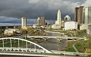 The Columbus Civic Center Historic District is a historic district comprising most of the civic center. It includes Central High School (NRHP-listed, 1924), Columbus City Hall (built 1928), the former Central Police Station (1928), the Ohio Judicial Center (NRHP-listed, 1933), and the Joseph P. Kinneary United States Courthouse (NRHP-listed, 1934).[2] It also includes the riverfront retaining wall, spanning from Broad to Town Streets. The c. 1921 Broad Street, Town Street, and Main Street Bridges were listed, though they were replaced on recent decades by the Discovery Bridge, the Rich Street Bridge, and a new Main Street Bridge. The buildings immediately north and south of the Ohio Judicial Center were included as non-contributing buildings.[3]